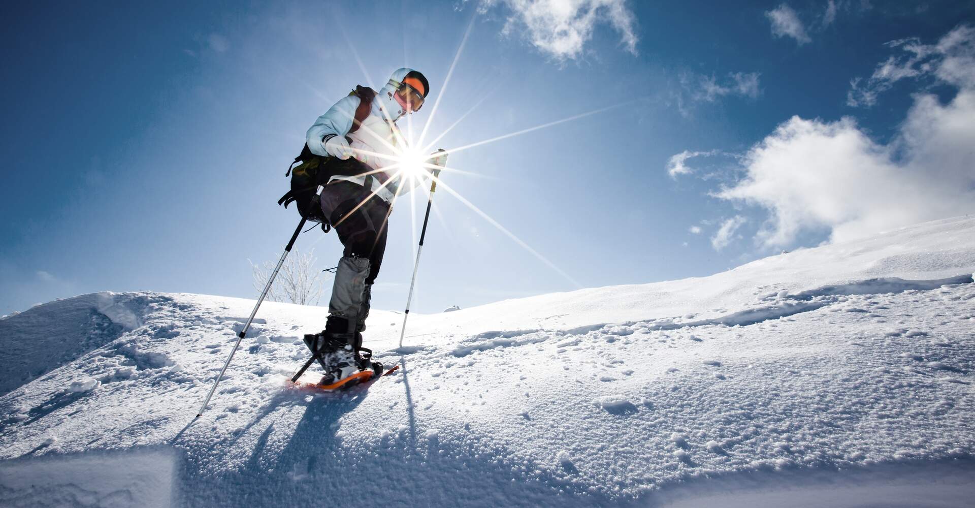Schneeschuhwanderer kommen über den ausgeschilderten ICE CAMP Trail (Start Alpincenter) zum ICE CAMP Sonnendeck presented by Audi.