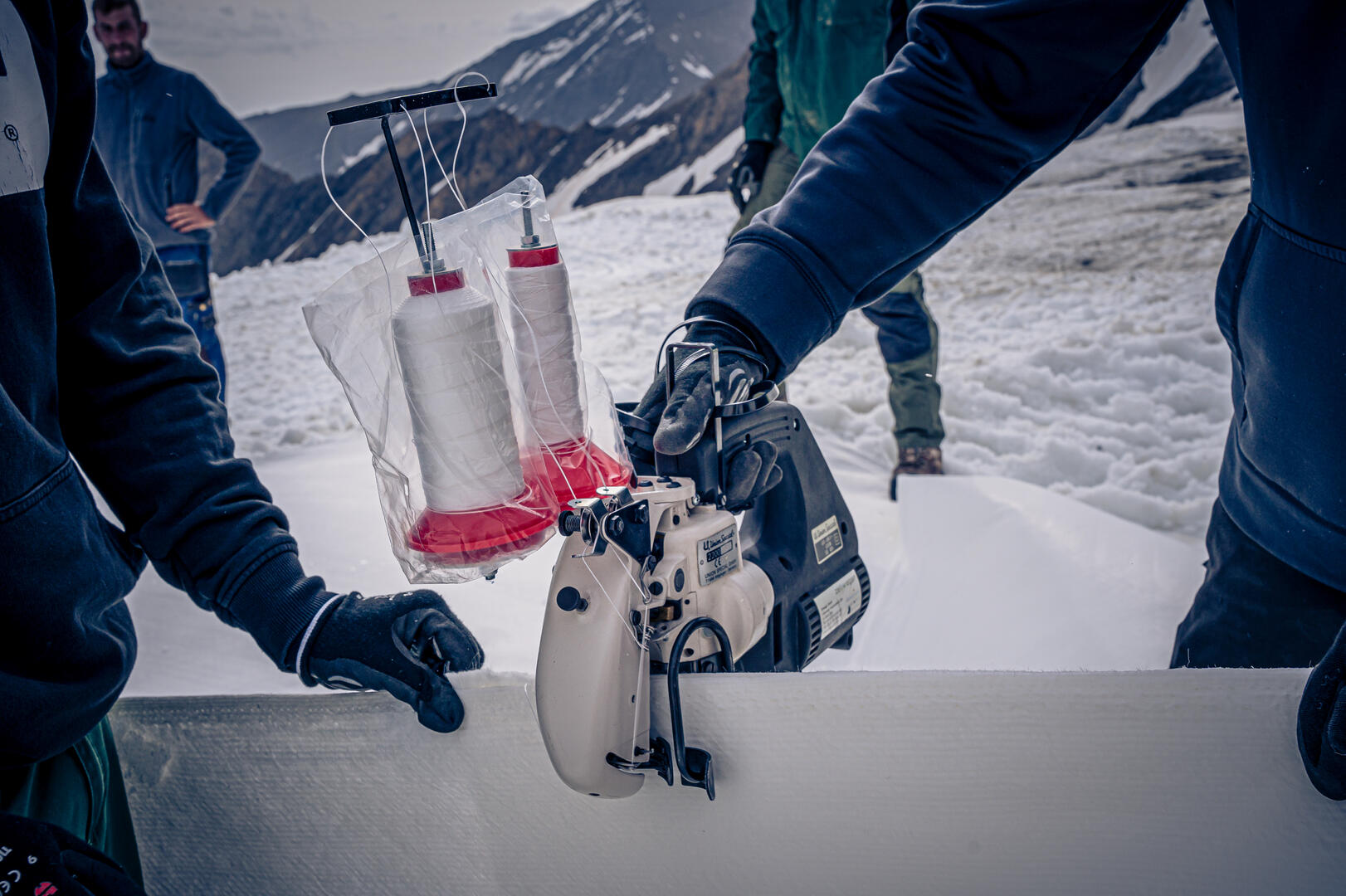 Damit das Vlies auch bei Sturm an seinem Platz bleibt, werden die vier Meter breiten Bahnen fest miteinander vernäht. Schneimeister und in diesem Fall „Vlies-Schneidermeister“ Stefan Bürgler weiß mit der Handnähmaschine bestens umzugehen. Gekonnt fädelt er die Fäden der zweispuligen Maschine ein und näht die überlappenden Vliesbahnen im Kettstich aneinander. „Im Herbst, wenn die Depots wieder vom Vlies befreit werden, löst man diesen Stich wie bei einem Kartoffelsack mit einem einzelnen Ruck am Faden. So können die gleichen Vliesbahnen bis zu vier Mal wiederverwendet werden“, verrät der Pistenchef und koordiniert sorgfältig das Auflegen der Bahnen auf dem großen Schneedepot. Handgefüllte Sandsäcke mit je drei Kilo sorgen an den Enden der Vliesbahnen für reichlich Ballast, damit sich die Vliesdecke auch bei Sturm nicht vom Depot hebt.