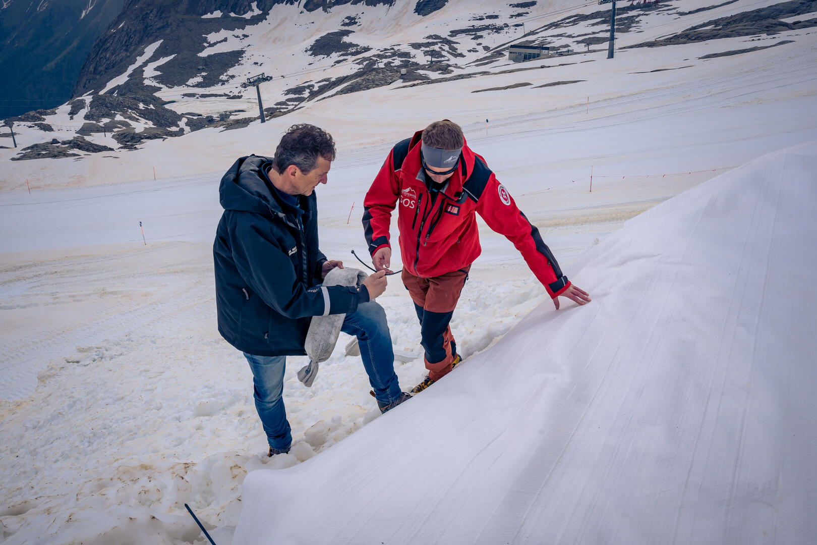 Während zehn Männer die großen Vliesrollen von der Pistenraupe heben, erzählt Günther Brennsteiner: „Das Vlies wurde über die Jahre speziell für Schneedepots in Skigebieten entwickelt. Es ist enorm reißfest und reflektiert das Sonnenlicht. Bei starkem Regen sorgt die eingearbeitete Struktur, dass das Wasser geordnet und nicht als Sturzbach abfließt.“