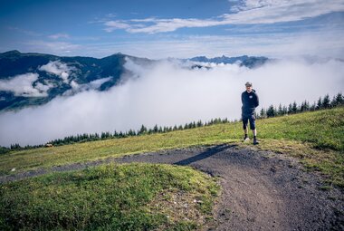 „Gscheid vü Flow“, denke ich, als ich in der Wiese neben dem Maiskogel Trail hocke und den Biker beobachte, der eben an der Bergstation an den Start gegangen ist. Geschmeidig rollt er über die sanften Wellen, drückt das Bike in den Anlieger und kommt vor mir zu stehen. Noch bevor er den Helm lüftet, erkenne ich ein breites Grinsen unter dem Fullface-Helm. Es ist Streckenbauer Roland Hofer, der mit seinem Team von Shape-Syndicate den Trail vom Maiskogel betreut. „Heute habe ich selbst die morgendliche Kontrollfahrt erledigt, um die Strecke für den Betrieb freizugeben“, strahlt er und sichtlich hat der leidenschaftliche Biker die frühe Fahrt über den Trail genossen. Schnell sind Bike, Helm und Schutzausrüstung abgelegt und das Pinzgauer Urgestein des Trail-Baus gesellt sich zu mir und friedlich grasenden Kühen auf die blühende Wiese.
