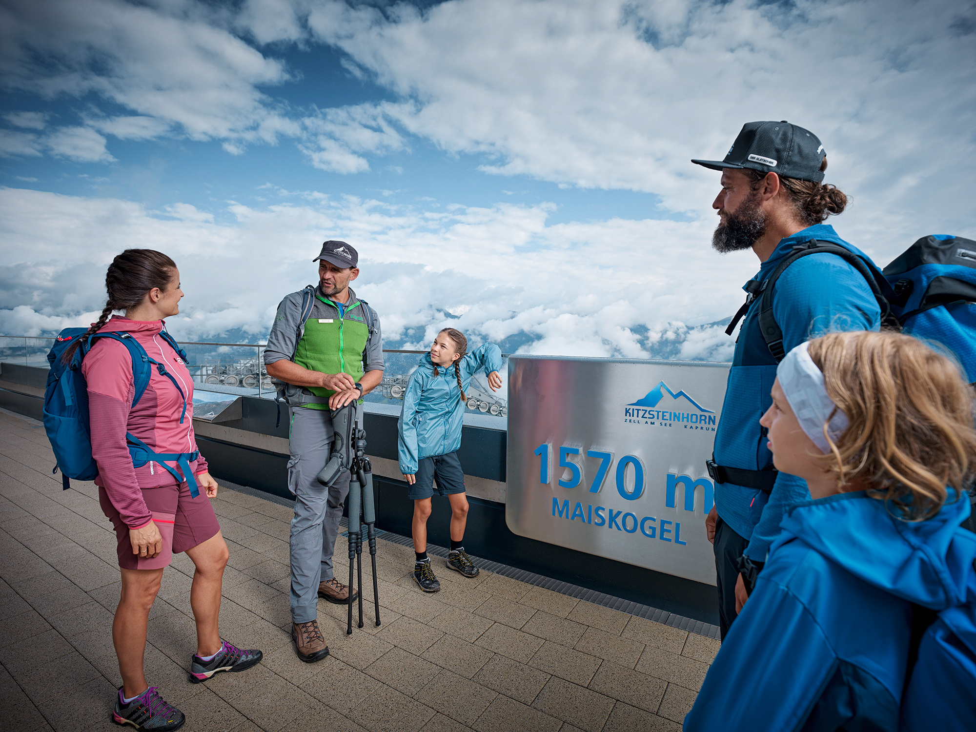 Wandergruppe steht am Aussichtspunkt Maiskogel mit Panoramablick auf die Berge