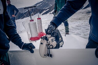 However time and strength consuming creating reserves may be for the team, the sustainability factor and the positive effect they have on glacier ice make the effort worth it. Brennsteiner reports: "Open Air Lab scientists examine glacier loss owing to climate change every year by means of drone imaging. The collected data has shown not only a stop in glacier mass loss in the reserve areas, but even a growth here and there, especially by reserves located higher up the mountain. In the ICE ARENA reserve area, for instance, a growth of 2.5 meters could be recorded over the course of eight years. That motivates us to further deepen our knowledge in snow farming."