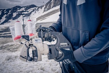 In order for the fleece to remain in place also in case of a storm, the four-meter-broad sheets are stitched up tightly. Snow-making manager and, in this case, "fleece-cutting master"Â Stefan Buergler knows exactly how to use the handheld sewing machine. He skillfully threads the strings of the two-spool sewing machine and chainstitches up the overlapping fleece sheets. "In fall, when the fleece is removed from the reserves, the stitch can be taken out with one tug. That way, we can reuse the fleece sheets up to four times", Buergler explains. Hand-filled sandbags with three kilograms each weigh down the fleece sheets so they are not carried away by a storm.
